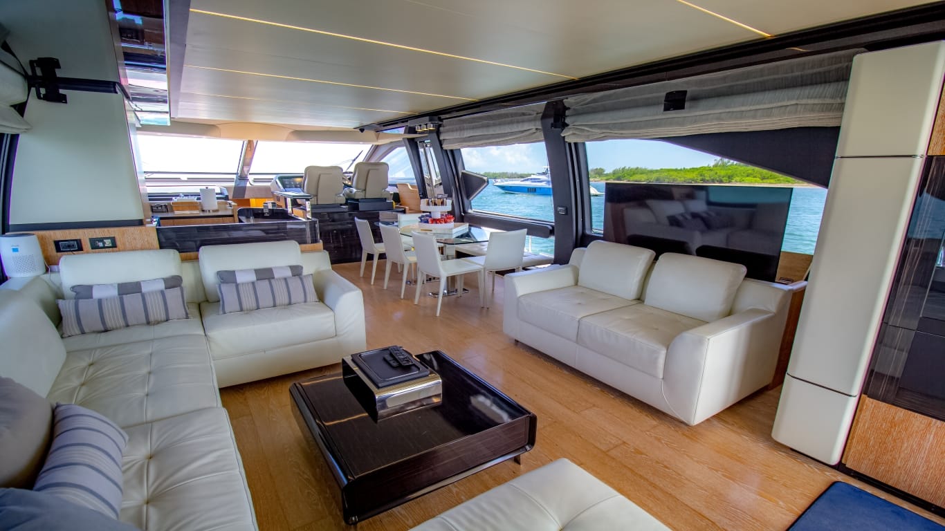 This beautiful yacht constructed with carbon fiber offers a dynamic and comfortable interior layout; With 4 cabins, including a master stateroom with a sitting area next to a breathtaking ocean view, a VIP stateroom, and two guest staterooms, all of them with en suite heads; there’s ample space to entertain, the bridge is inviting to enjoy the three outdoor areas to host your guests.