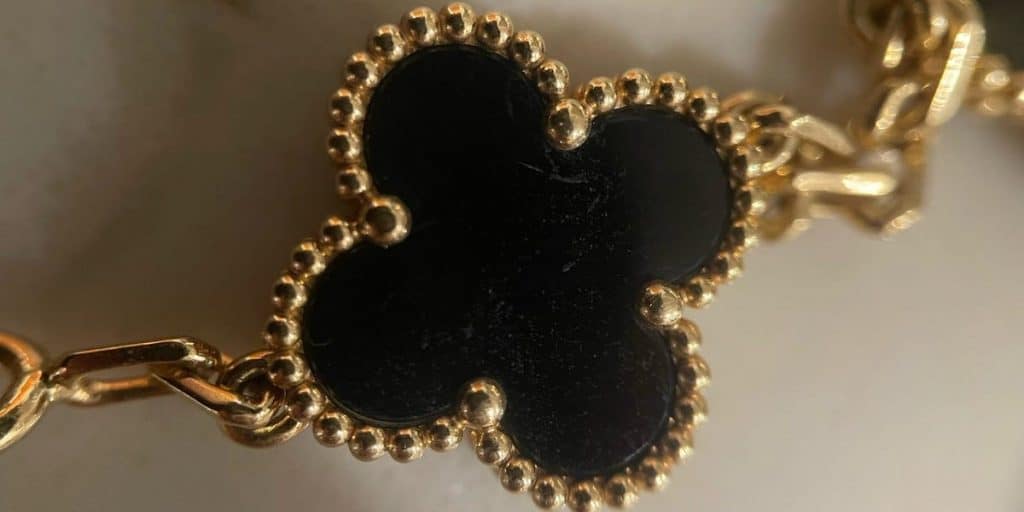 Another hallmark of genuine Van Cleef & Arpels jewelry is the meticulous attention to detail in the design. Pay close attention to the small spheres that outline the center stone of the clover. In authentic pieces, these spheres are uniform in size and perfectly crafted, reflecting the brand’s commitment to quality. Counterfeit pieces, however, often display inconsistencies in the size and shape of these spheres, with some being too large or too small. This lack of uniformity is a telltale sign that the piece may not be genuine.