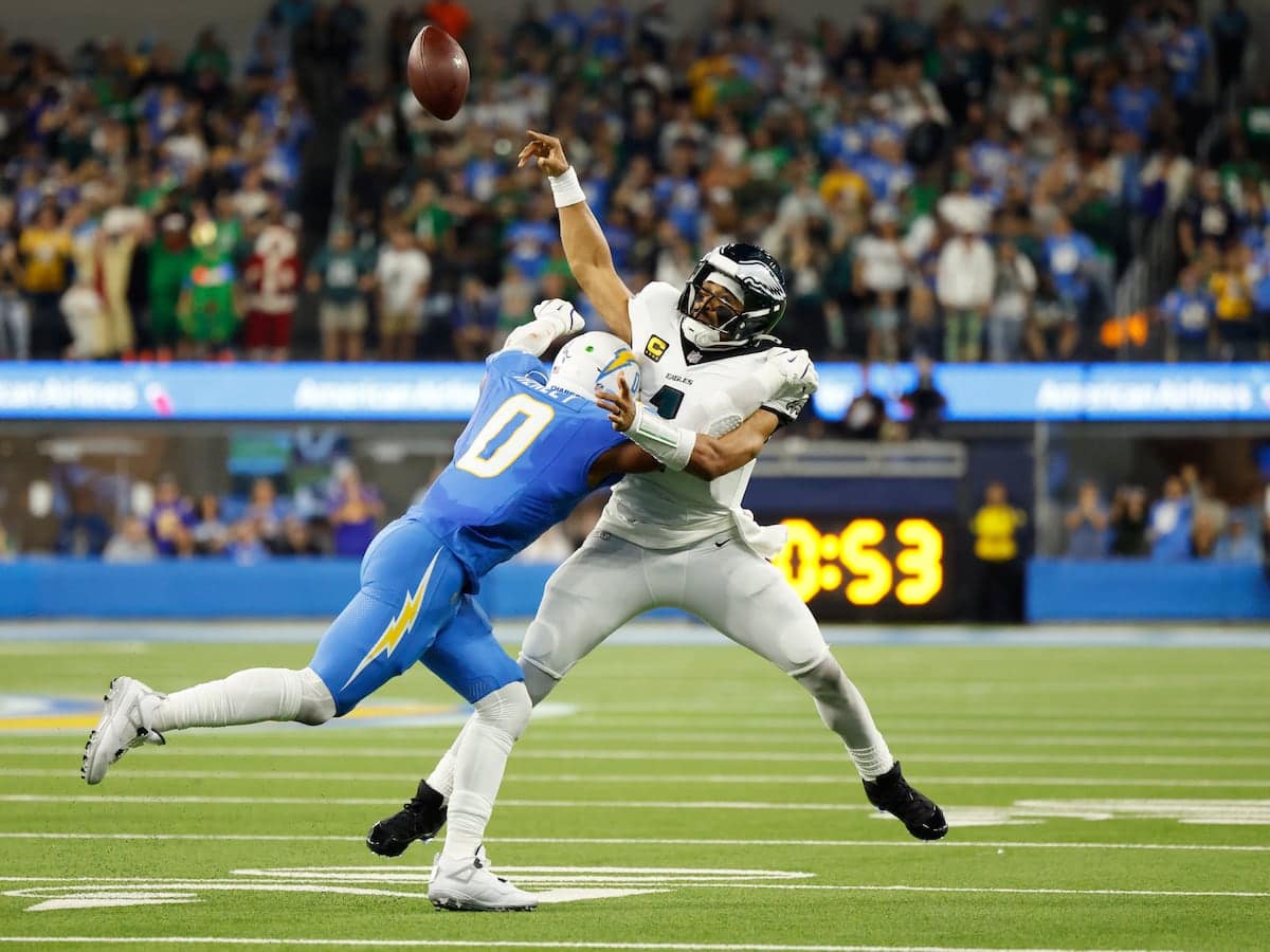 The Chargers (9-4) overcame Odafe Oweh’s penalty on a neutral zone infraction that gave the Eagles a first down on 4th and 4. One play later, Hurts threw deep to Jahan Dotson in double-coverage only to have Jefferson keep his feet in bounds on the game-ending play.