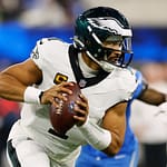 Eagles quarterback Jalen Hurts was 21 of 40 for 240 yards and four interceptions. In the first quarter, he had two turnovers on the same play as part of a chaotic sequence in which he was intercepted and he fumbled. Da’Shawn Hand picked off Hurts and then fumbled the ball before Hurts recovered and the quarterback fumbled and Troy Dye recovered to give the Chargers possession.