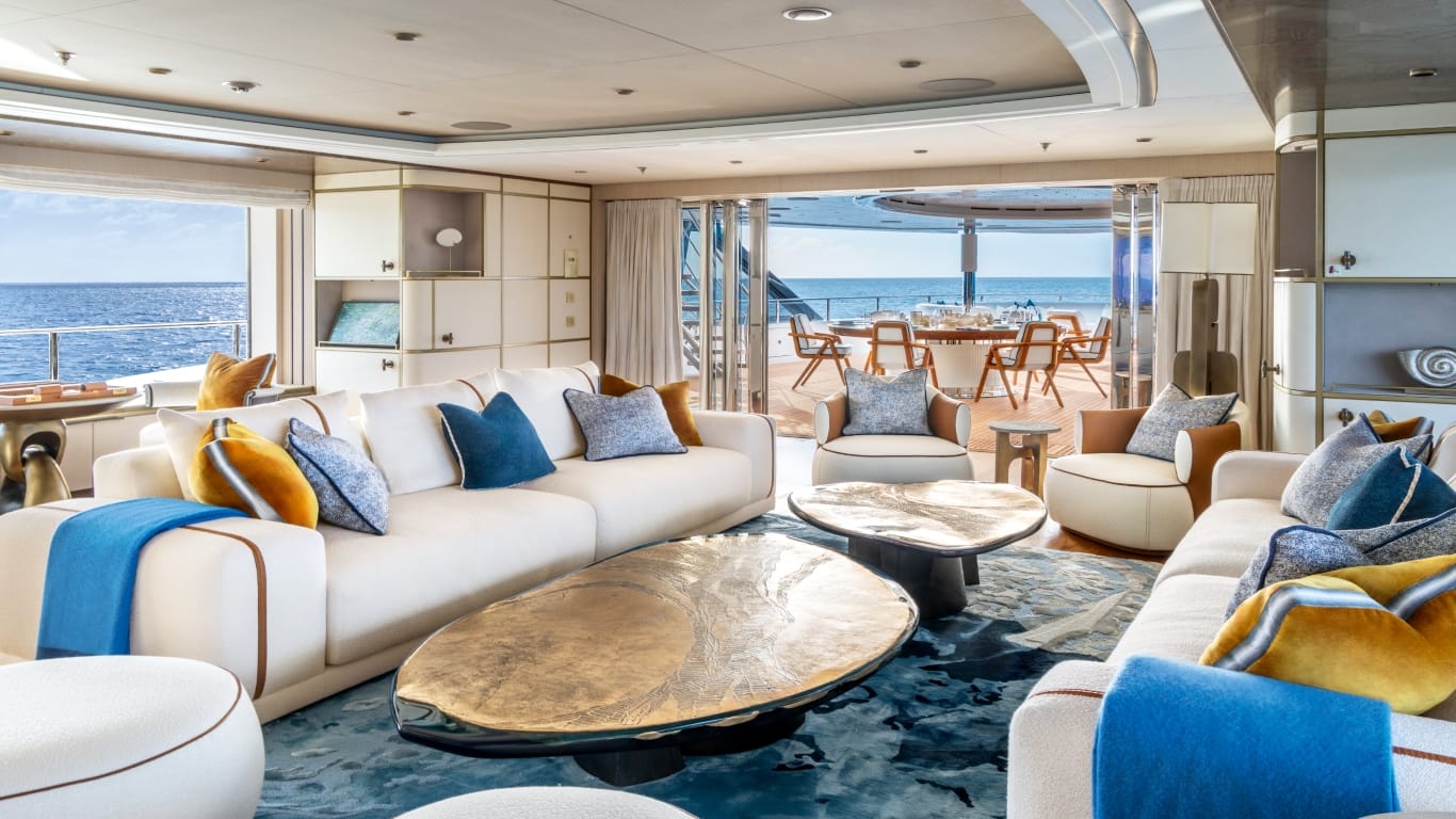 Interiors employ polished sycamore, nubuck, Java teak flooring and leather‑clad columns. The overall palette remains neutral—beige, grey and light woods—with peacock blue used as a unifying accent. Rounded custom furniture and the absence of sharp thresholds reinforce a fluid, informal ambience. Home‑automation and entertainment systems are accessible via tablets and QR codes throughout the yacht.