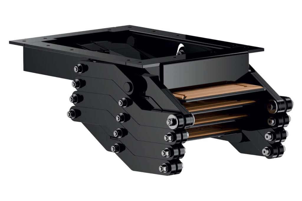 Douglas Marine’s E-step is a motorized folding ladder that installs under a yacht’s stern platform to give owners and guests easy access into and out of the water. The ladder’s opening and closing action was inspired by the scissor-like pantograph mechanism that links trams in Milan, Italy, to overhead power cables. E-step systems are built from powder-coated aluminum frames and are available with three or four steps, which are covered in nonslip EVA foam. Both models use electric linear actuators (12 or 24 volts) that are fitted into the frames and that are controlled by switches or optional remote controls. When the system is open, the frame’s geometry yields a 60-degree boarding angle, placing the ladder’s steps deeper into the water and providing better access into and out of the water.