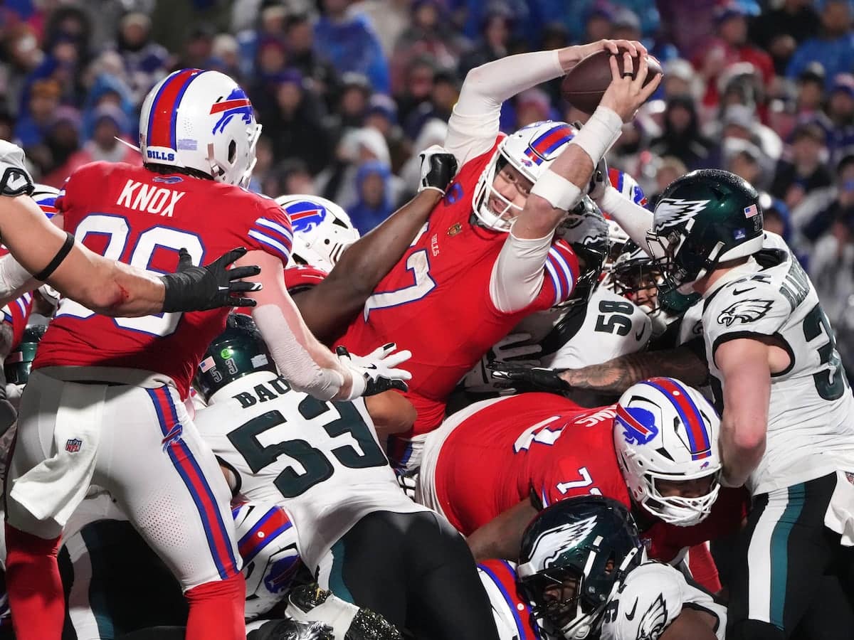Home Sports Eagles hang on to beat Bills 13-12 when Josh Allen misses an open Khalil Shakir on 2-point try