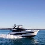 “There’s a clear view of the cockpit from the tournament-style helm control pod, and a clever notched windscreen design improves visibility across the foredeck. Side-mounted, single-lever controls and power-assisted hydraulic steering deliver pinpoint accuracy to make charging through an inlet or backing down on a blue marlin a snap.”