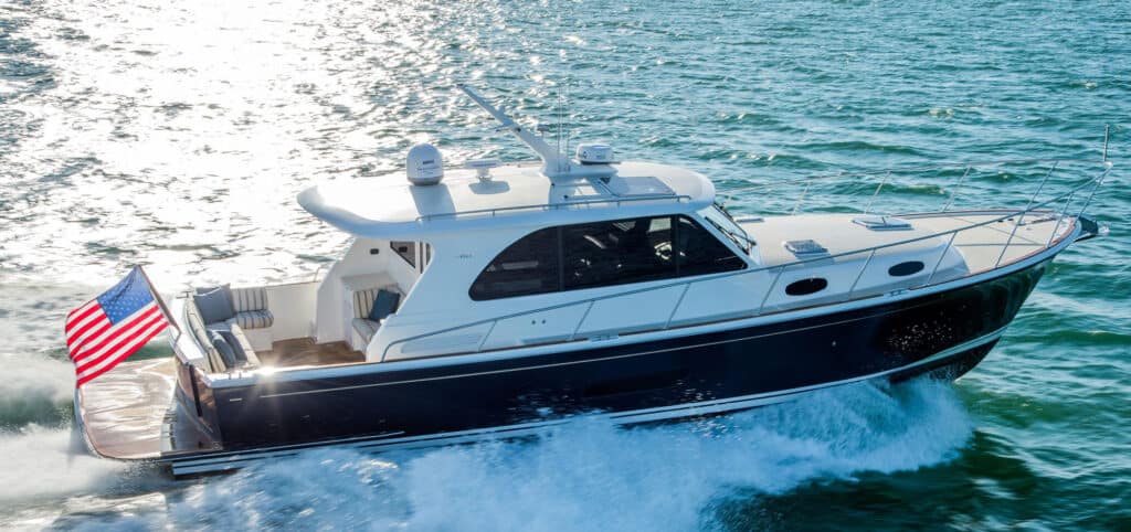 Grand Banks says, “The Eastbay 44 represents a remarkable fusion of iconic style and modern functionality. Its contemporary finishes, meticulous craftsmanship, and Downeast lines cater to both aesthetic preferences and performance needs. Its sleek silhouette is designed to turn heads in any marina, while its innovative engineering provides a safe and reliable onboard experience, offering the perfect blend of luxury, style, and functionality.”