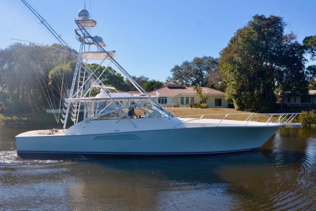 Yachting previously wrote: “Amenities include a master stateroom that features a walk around queen-size bed with private head and shower, built-in freezer and stowage space and a custom designed tuna tower that offers excellent visibility.”