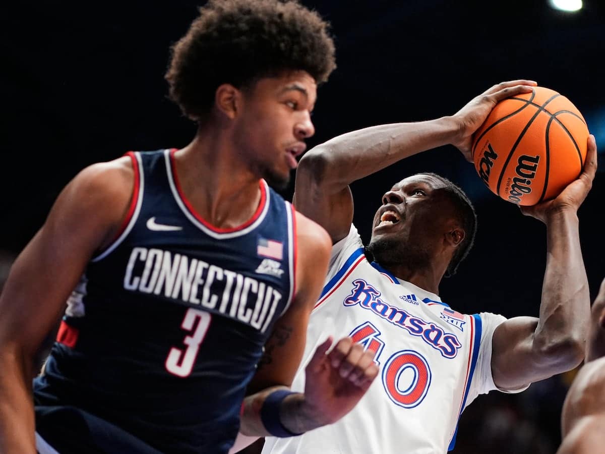 Both teams were missing stars: Kansas was without five-star prospect Darryn Peterson for the seventh time because of a lingering hamstring injury, and UConn played without big man Tarris Reed Jr. because of his own ankle injury.