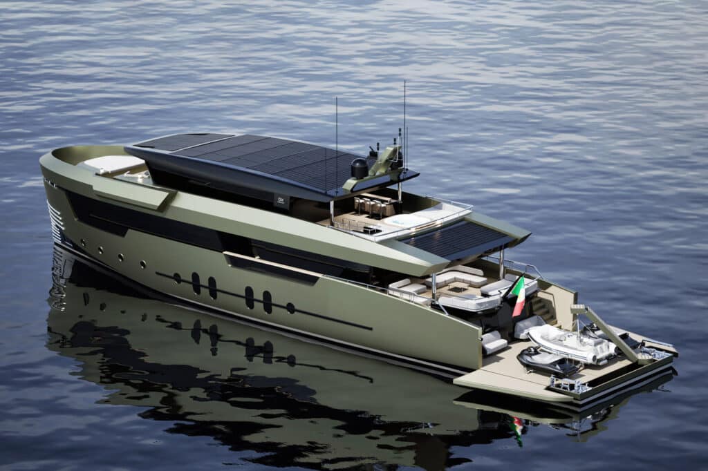 Exterior and interior design are by Marco Casali, who has created a seamless flow between the spacious decks and interiors. Owners can configure layouts with five or six en suite cabins for 10 to 12 guests, supported by a crew of up to seven. Options include an enclosed sundeck salon with 360-degree views for extreme-weather cruising, or a sundeck owner’s suite with private deck. Lifestyle amenities include a foredeck firepit lounge, extended aft deck with Jacuzzi and ample tender storage, with room for everything from a submersible to a land vehicle.