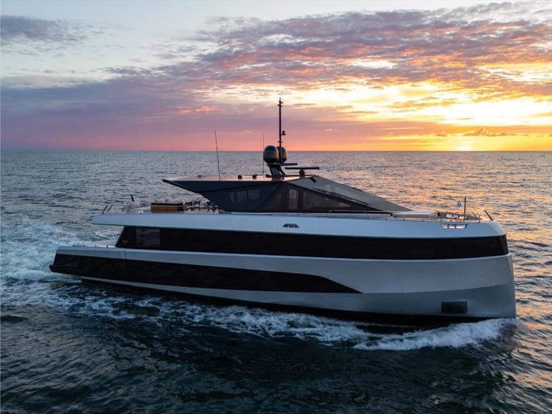 The yacht’s widebody design is a game-changer in its size category, allowing for large volumes and great living space without compromising stability or performance. The centerpiece of this design is the spectacular glazed bow, which stands 4.7 meters high and offers breathtaking 270-degree panoramic views. This unique feature not only enhances the aesthetic appeal but also provides a quiet space away from the engines.