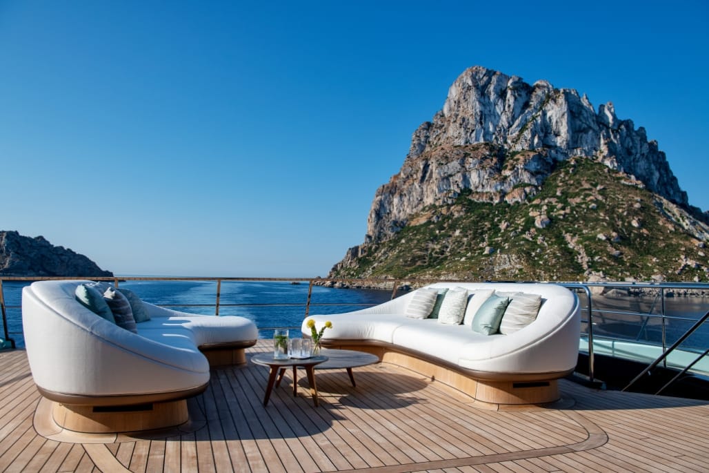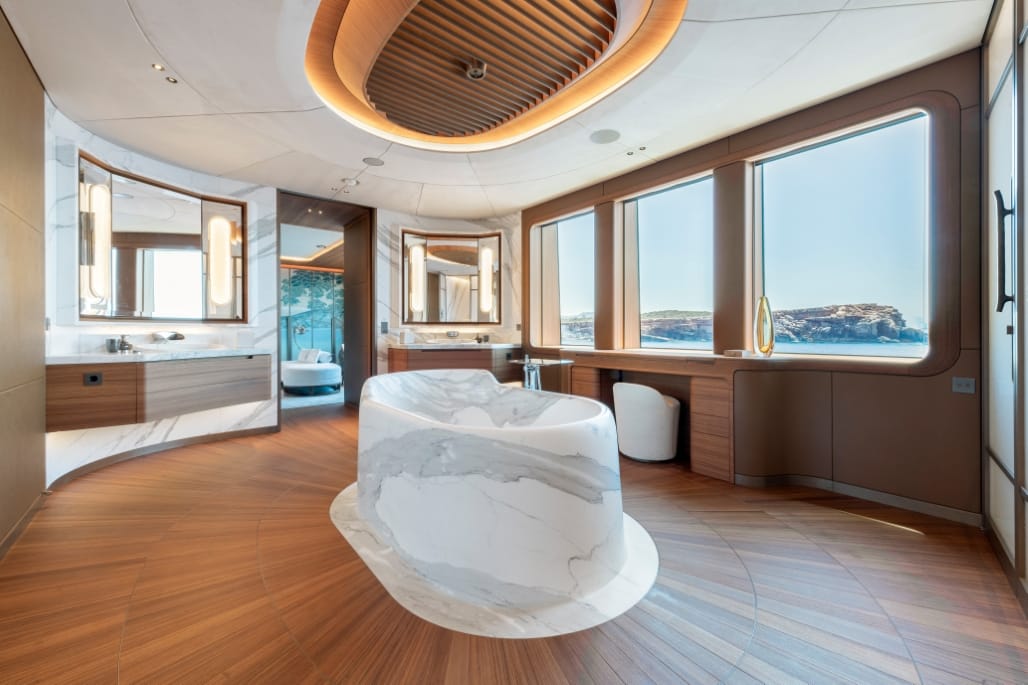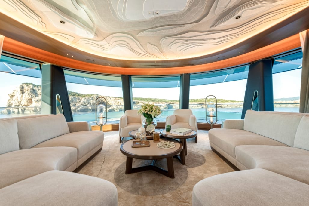 Rather than adhere to a conventional aft‑main saloon layout, Kenshō places guest suites and private areas at the heart of the main deck while communal living shifts to the upper deck. There a panoramic skylounge offers 180‑degree forward views and converts into a cinema, emphasising intimacy with the sea. Wide corridors and 2.7 m‑high ceilings reinforce a sense of volume and flow throughout the accommodation.