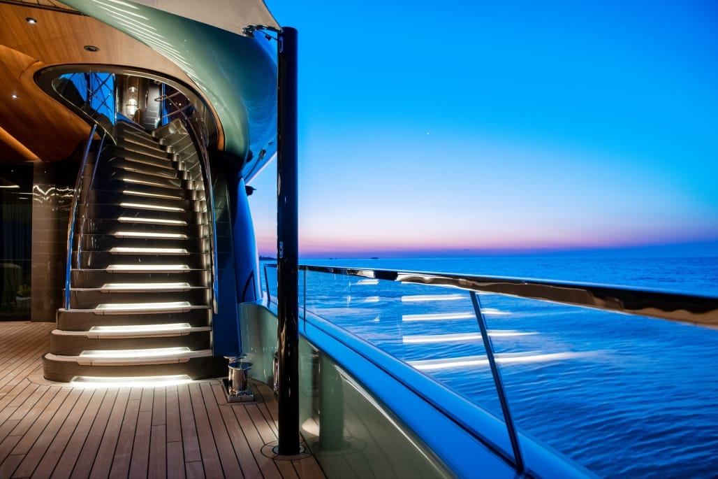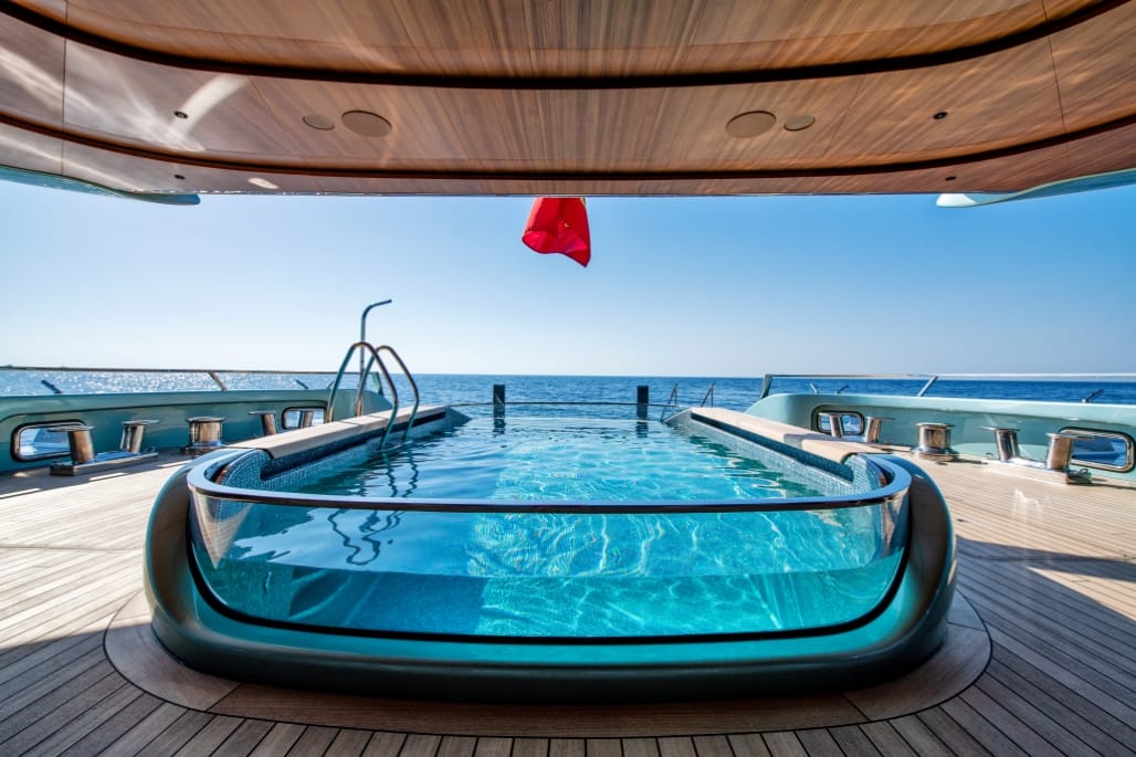 Jouin Manku’s interiors take cues from Japanese aesthetics; the yacht’s name — Kenshō, a term for “seeing one’s true nature” — informs the restrained palette and tactile finishes. The owner’s full‑beam suite occupies the forward portion of the main deck and includes a private lounge, dressing room and marble bathroom. Outdoor living spans four decks and culminates on a generous swim platform that houses a 5.5 m (18 ft) glass‑fronted pool finished with metallic detailing. The sundeck offers a forward Jacuzzi and a bespoke lighting installation inspired by bioluminescence; a gym with ocean views, elevator to all decks and a side‑loading garage for toys complete the onboard programme.
