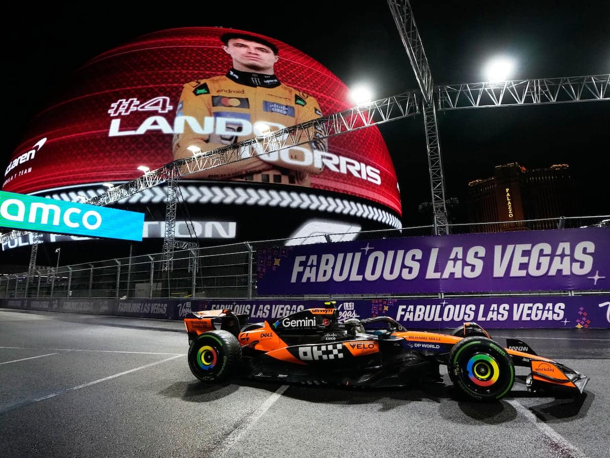 LAS VEGAS (AP) — Formula 1’s title contenders mastered the wet and slick Las Vegas Strip in a rainy Friday night qualifying session that saw championship leader Lando Norris take pole.