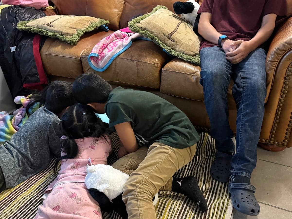 The younger siblings settled in quickly, nestling on the couch in pajamas to share a bag of Cheetos and opening a coloring book to draw butterflies. The house soon sounded like any other filled with the shrieks and giggles of small children at play.