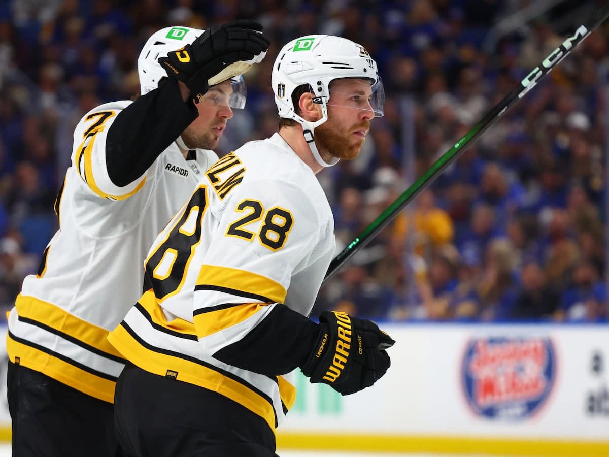 Catching Buffalo on a line change, Hampus Lindholm fed a pass up the right boards to find Pastrnak in stride just as he crossed the blue line. Driving in alone on net a step ahead of Buffalo’s Mattias Samuelsson, Pastrnak faked cutting across the front and nearly lost his balance before slipping the puck inside the right post.