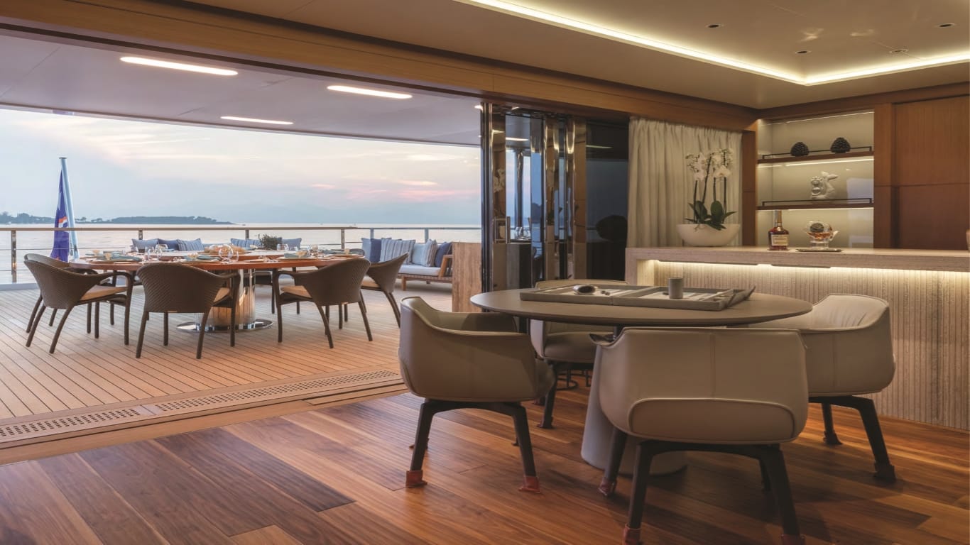 Resort‑style features are concentrated at sea level and on the owner’s deck. The beach club furnishes a waterside lounge with a bar, gym equipment and a hammam, augmented by fold‑down terraces that open directly to the water. A wellness area adjacent to the beach club includes a treatment room and gym. The yacht hosts two pools — a forward owner’s pool/jacuzzi and a glass‑bottom aft pool above the beach club that admits natural light to the lounge below — plus multiple al‑fresco dining and relaxation spaces on the bridge and main decks.