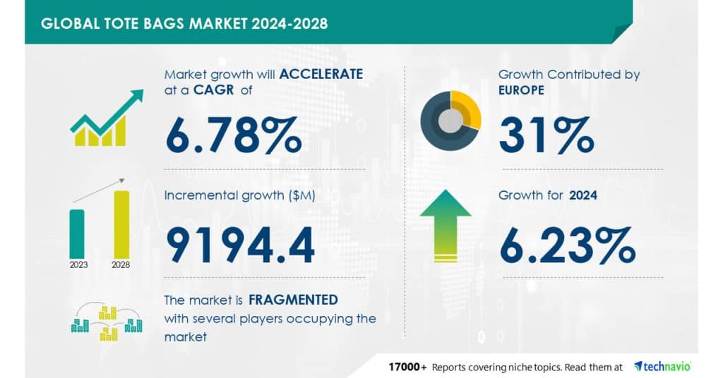 As we step into 2024, the global tote bags market is poised for significant growth, with an estimated increase of USD 9.19 billion from 2024 to 2028, according to a recent report by Technavio. This growth is underpinned by a compound annual growth rate (CAGR) of 6.78% during the forecast period. The driving forces behind this expansion are multifaceted, with artificial intelligence (AI) playing a pivotal role in reshaping market dynamics, enhancing personalization, and optimizing operational efficiencies.