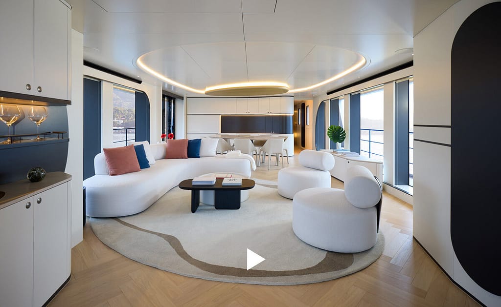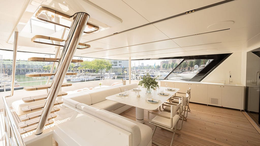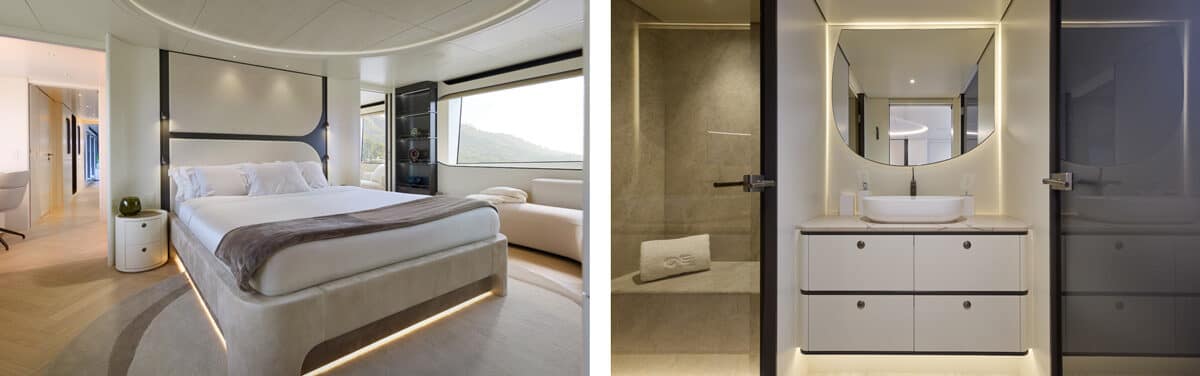 ONE is the product of a deliberate collaboration between exterior designer Guido de Groot and interior designer Carla Guilhem. De Groot’s exterior work gives the yacht a resolute silhouette: clean, forward‑thrusting lines with the aft fashion plates rising to meet the hardtop in a continuous sweep. Guilhem’s interiors aim to balance beauty with livability, producing a comfortable environment intended for extended cruising and entertaining.