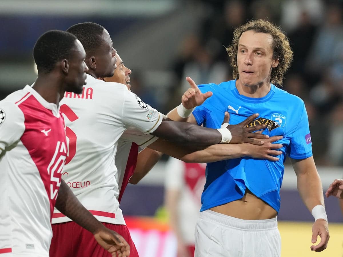 David Luiz is back in Europe with Pafos after four years in his native Brazil, and he soared at a corner in the 18th to guide a powerful header into the top corner of the Monaco net.