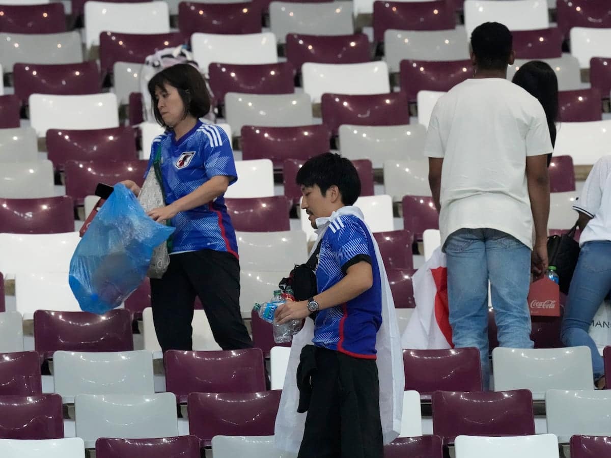At the World Cup in Russia in 2018, Japanese players famously cleaned the dressing room after a loss and left a thank-you note in Russian. In 2022, fans left thank-you notes on rubbish bags written in Arabic, English and Japanese.
